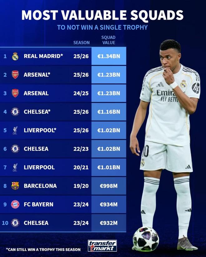 北京时间4月27日,德转统计出了赛季无冠身价最高的10支球队,本赛季的皇家马德里预计将以13.4亿欧元的总身价打破阿森纳在上赛季创造的纪录。