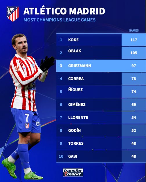 把格里兹曼放在马竞队史的欧冠坐标系里,位置很清楚。这一夜是他代表马竞踢的第97场欧冠。